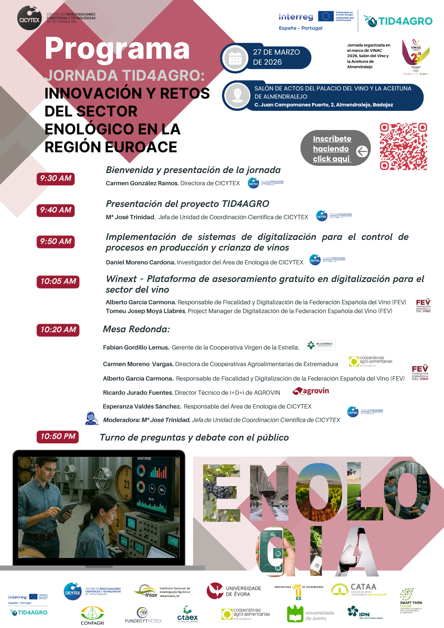 Se trata de una actividad coordinada por CICYTEX. El tema central, en torno al cual se organizaron los diferentes actos programados, fue la aplicación de tecnologías basadas en soluciones digitales e innovadoras destinadas a facilitar y optimizar los procesos de vinificación, crianza y estabilización de los vinos.